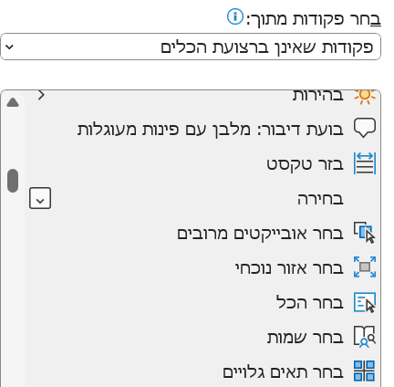 לחיצה על המשולש הקטן בקצה סרגל הכלים-> פקודות נוספות->בחר פקודות מתוך (לבחור "שאינן ברצועת הכלים")